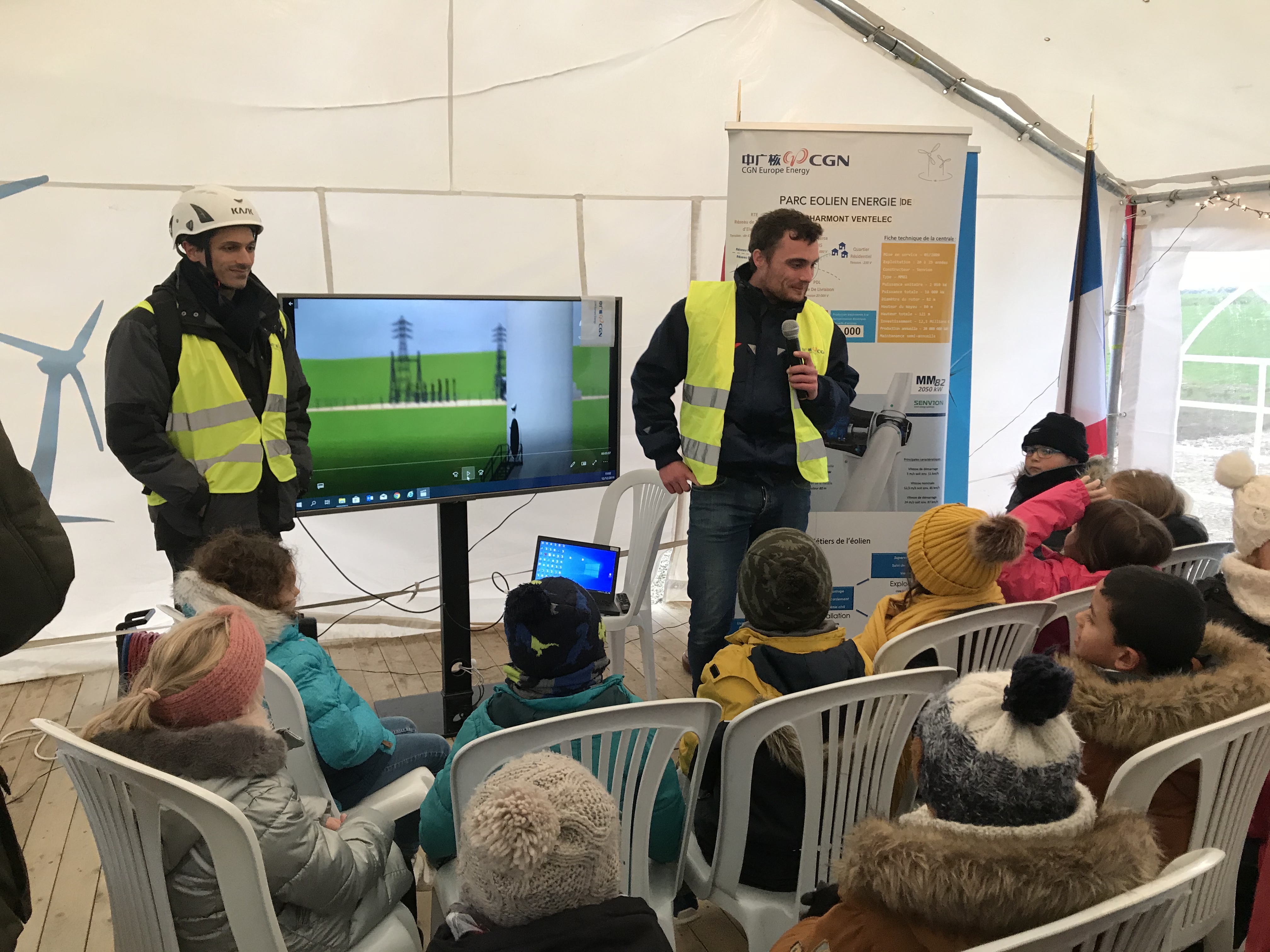 2019年12月,歐能公司舉辦風(fēng)場(chǎng)開放日,圖為工作人員在為小學(xué)生們講解風(fēng)機(jī)運(yùn)行原理